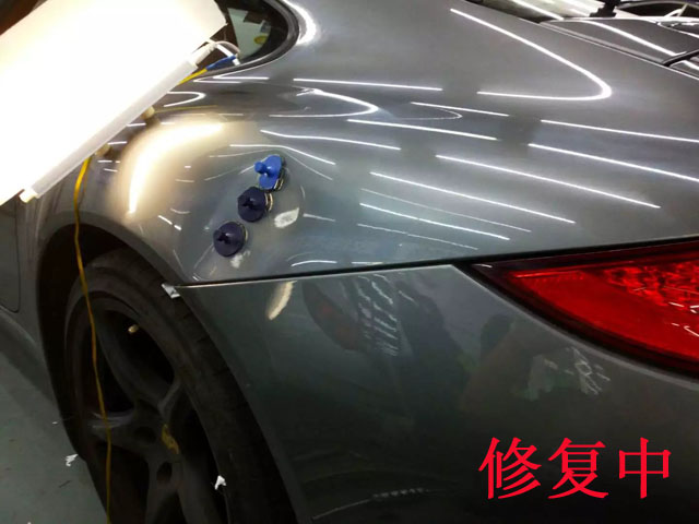 大家肯定會(huì)問(wèn)為什么不選擇鈑金噴漆?鈑金噴漆修復(fù)車身凹陷,有點(diǎn)屬于暴力行為,一般車主都會(huì)感到心疼,更何況保時(shí)捷車主了,所以第一時(shí)間就把鈑金噴漆淘汰了!那好,我們就直接用汽車無(wú)痕凹陷修復(fù)方式來(lái)修!下圖大家看到的是利用汽車凹陷修復(fù)拉拔器在車身外部,利用拉拔的方式恢復(fù)車身外形,工具雖然簡(jiǎn)單,重要的還是靠技師的修復(fù)技術(shù)和經(jīng)驗(yàn)!因?yàn)槊總€(gè)凹陷在外部步進(jìn)行初步修復(fù)時(shí),選擇吸盤(pán)的粘附點(diǎn)才是最重要的!
