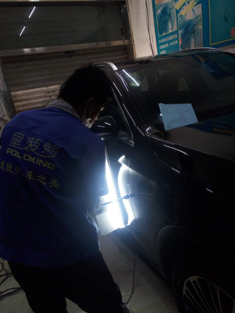 第二個(gè)吸盤拔下來后,可以看出車門凹陷基本完全恢復(fù)了,但是我們皇菠蘿師傅仍然認(rèn)為不完美,于是開始細(xì)節(jié)的修復(fù),利用整平筆敲打修復(fù),后來又用吸盤吸一次!