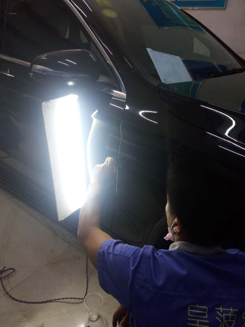 通過圖片可以看出奔馳車門凹陷位于右前門,而且呈線狀凹陷,修起來有一定難度,奔馳車主再三叮囑不要拆卸車身任何零部件,因此我們只能從車身外部利用拉拔等方式進(jìn)行修復(fù)!
